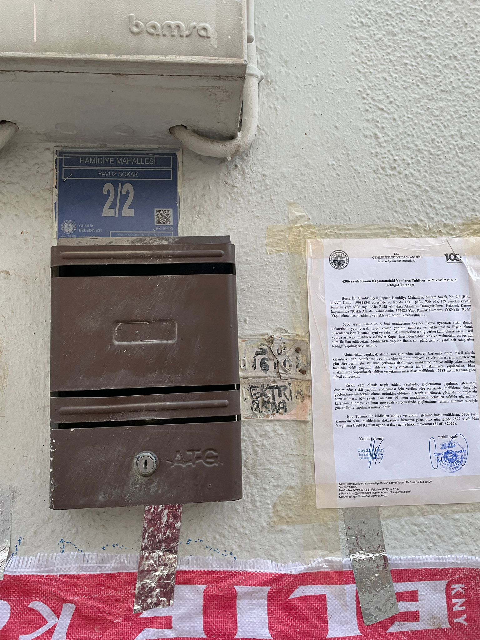 Bursa İli, Gemlik İlçesi, tapuda Hamidiye Mahallesi, Meram Sokak, No: 2/2 (Bina UAVT Kodu: 19983834) adresinde ve tapuda 4.O.1 pafta, 756 ada, 139 parselde kayıtlı bulunan yapı 6306 sayılı Afet Riski Altındaki Alanların Dönüştürülmesi Hakkında Kanun kapsamında “Riskli Alanda” kalmaktadır/ 327485 Yapı Kimlik Numarası (YKN) ile “Riskli Yapı” olarak tespit edilmiş ve riskli yapı tespiti kesinleşmiştir.