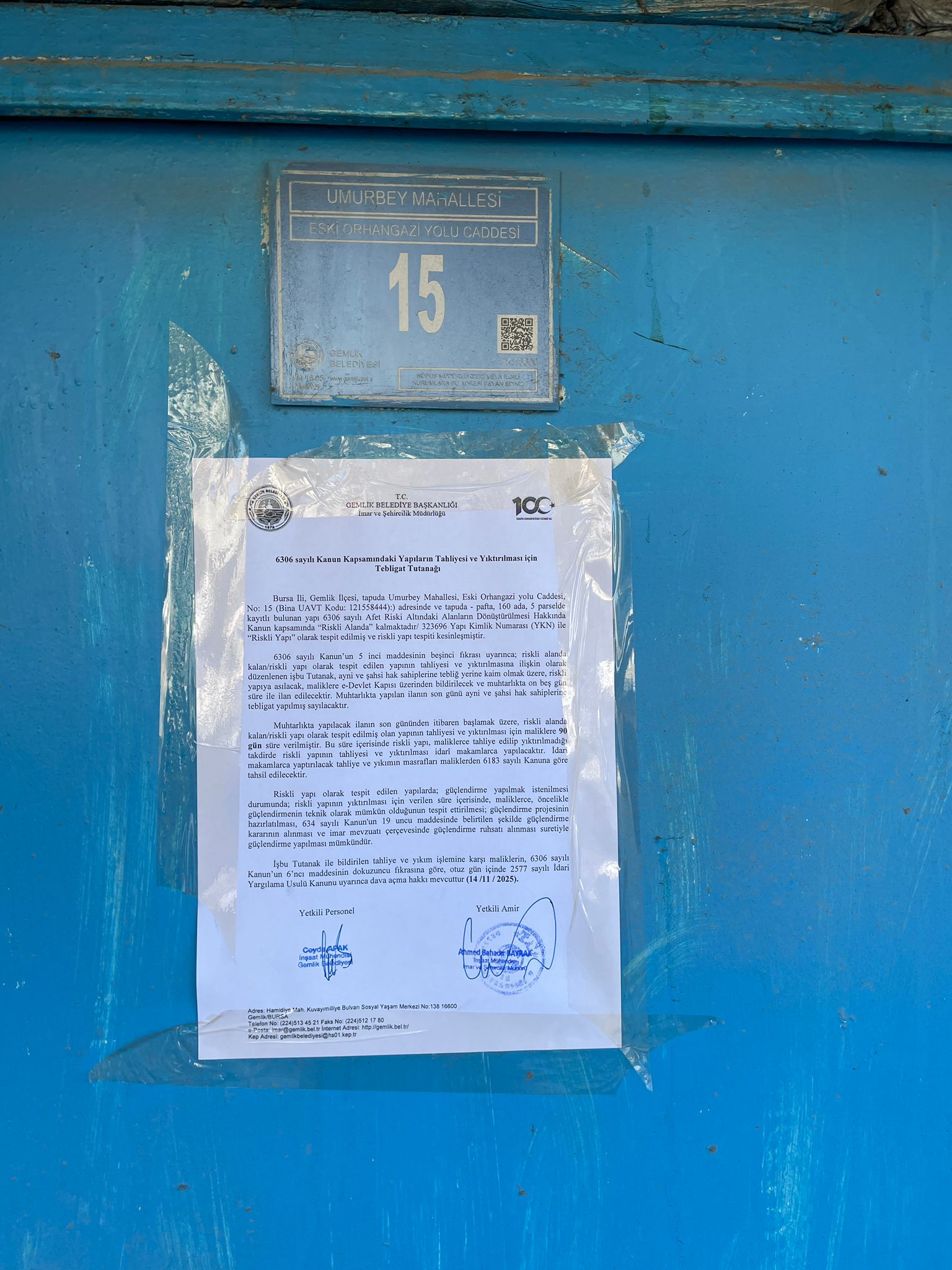 Bursa İli, Gemlik İlçesi, tapuda Umurbey Mahallesi, Eski Orhangazi yolu Caddesi, No: 15 (Bina UAVT Kodu: 121558444):) adresinde ve tapuda - pafta, 160 ada, 5 parselde kayıtlı bulunan yapı 6306 sayılı Afet Riski Altındaki Alanların Dönüştürülmesi Hakkında Kanun kapsamında “Riskli Alanda” kalmaktadır/ 323696 Yapı Kimlik Numarası (YKN) ile “Riskli Yapı” olarak tespit edilmiş ve riskli yapı tespiti kesinleşmiştir.