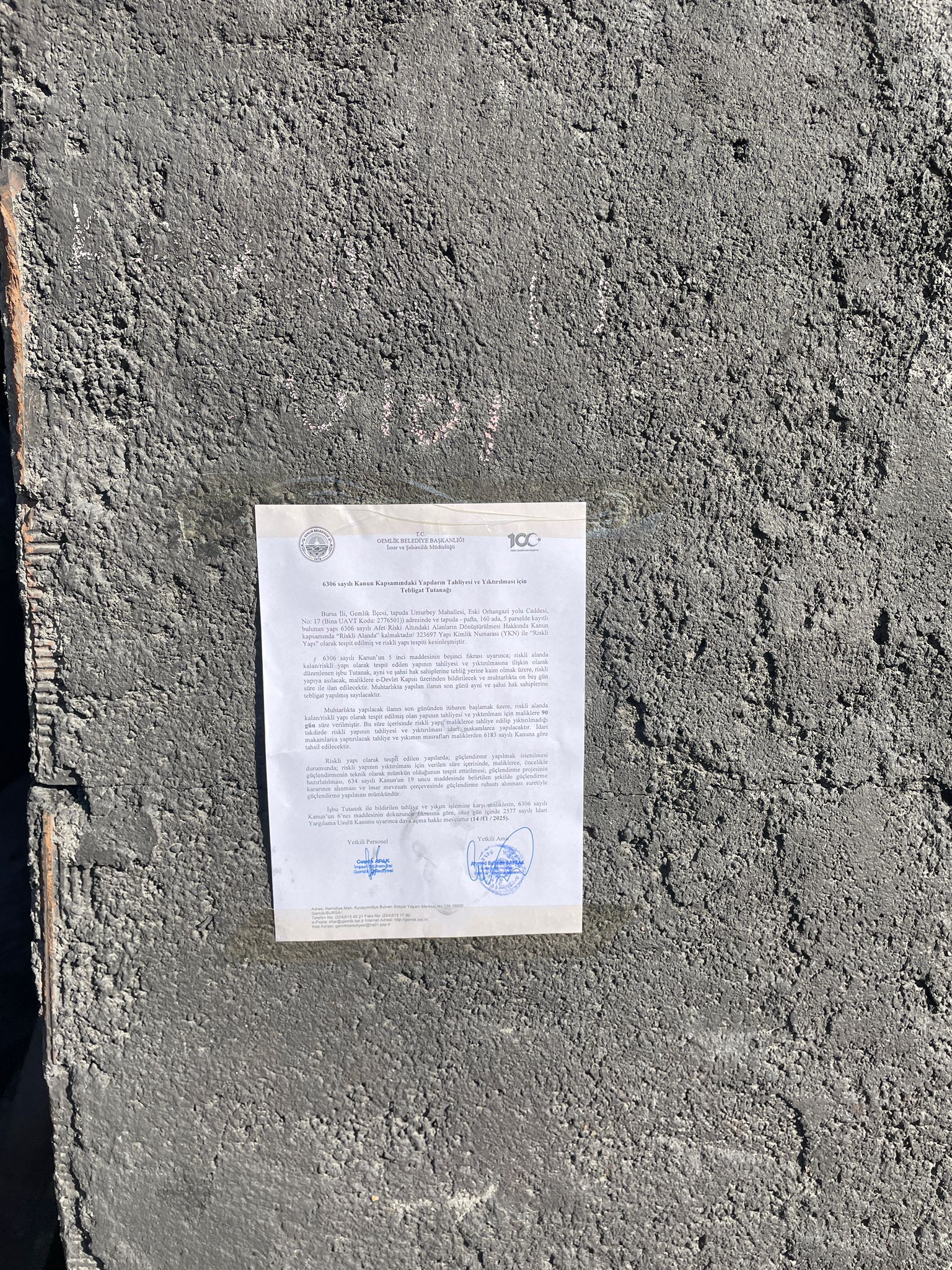 6306 sayılı Kanun’un 5 inci maddesinin beşinci fıkrası uyarınca; riskli alanda kalan/riskli yapı olarak tespit edilen yapının tahliyesi ve yıktırılmasına ilişkin olarak düzenlenen işbu Tutanak, ayni ve şahsi hak sahiplerine tebliğ yerine kaim olmak üzere, riskli yapıya asılacak, maliklere e-Devlet Kapısı üzerinden bildirilecek ve muhtarlıkta on beş gün süre ile ilan edilecektir. Muhtarlıkta yapılan ilanın son günü ayni ve şahsi hak sahiplerine tebligat yapılmış sayılacaktır.