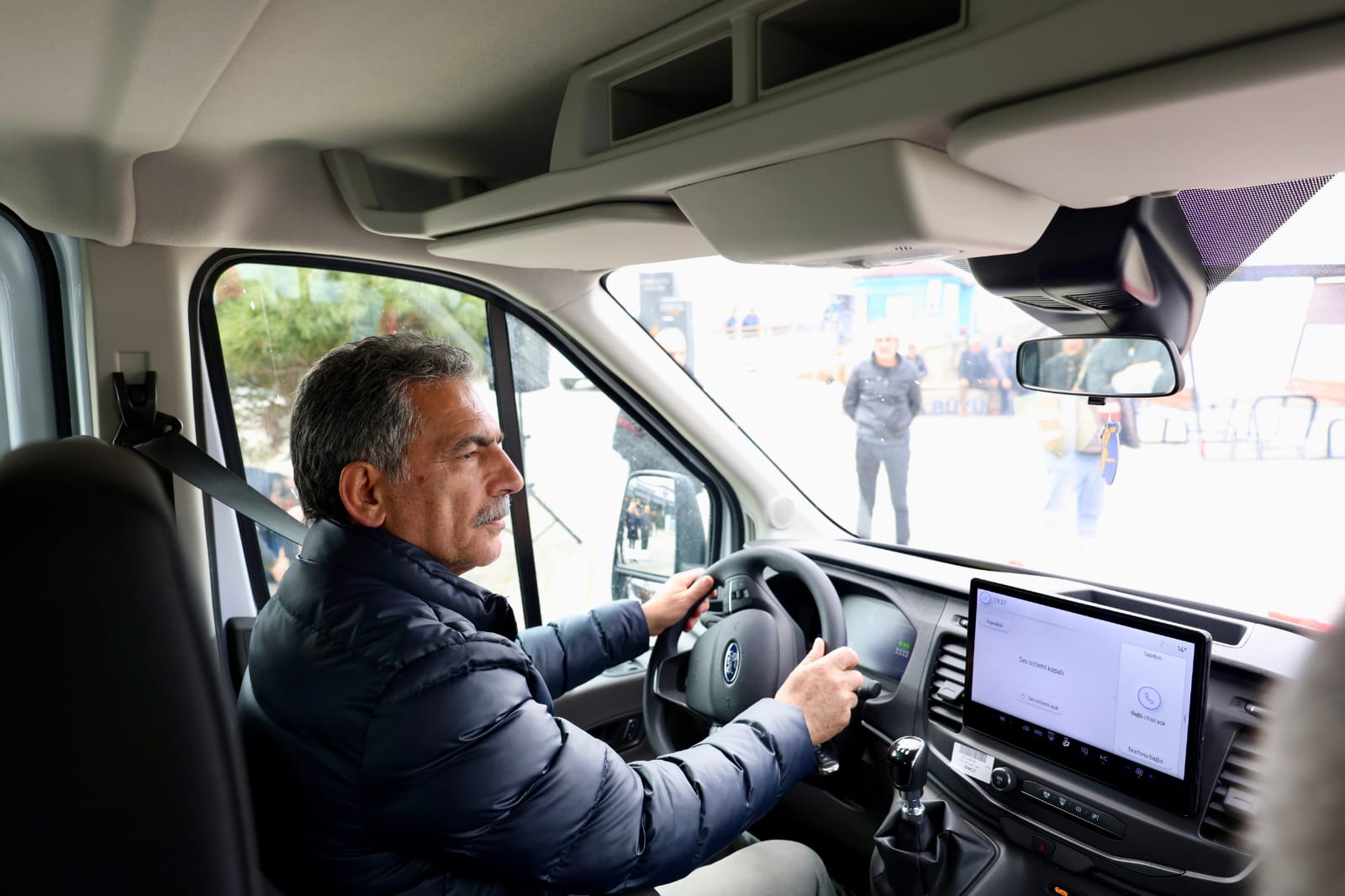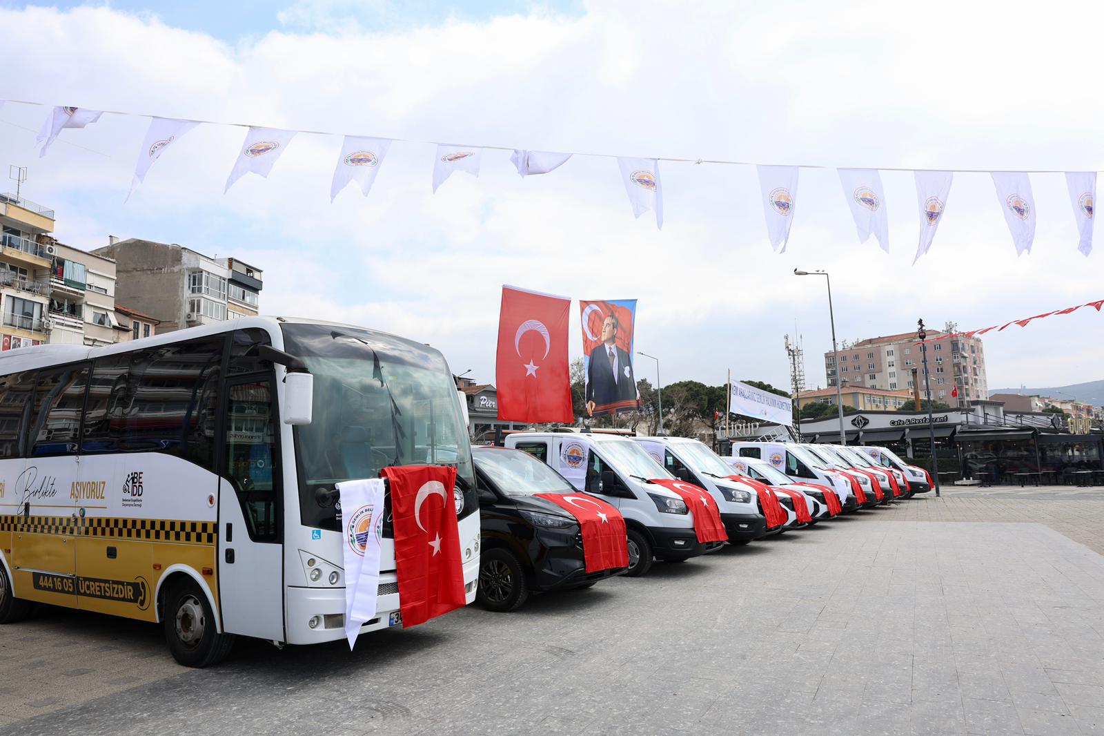 Yeni hizmet araçları, Gemliklilerin incelemesi için İskele Meydanı'nda sergilendi. Filoda kamyonet, minibüs ve arazi araçları bulunuyor.