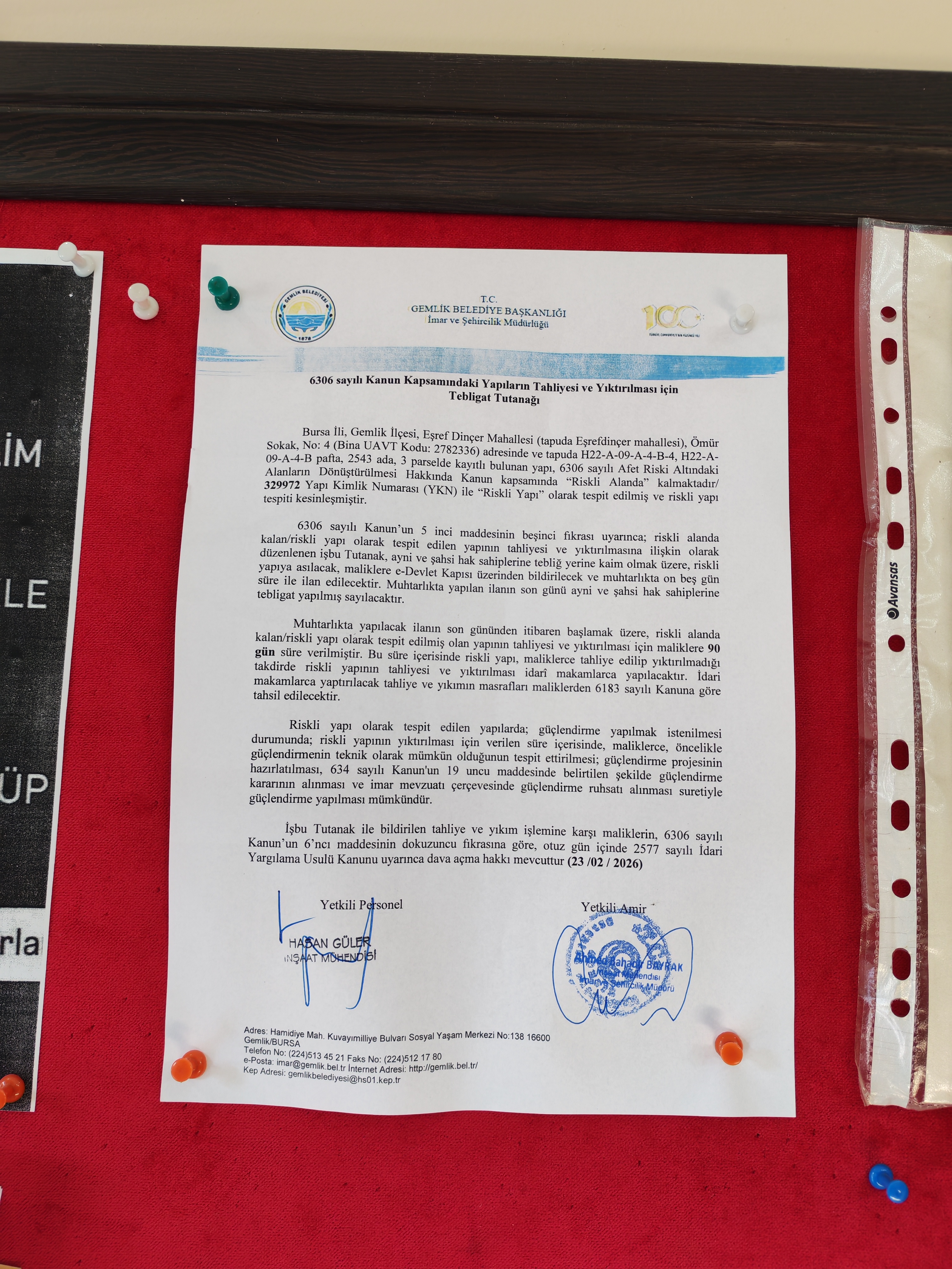 6306 sayılı Kanun’un 5 inci maddesinin beşinci fıkrası uyarınca; riskli alanda kalan/riskli yapı olarak tespit edilen yapının tahliyesi ve yıktırılmasına ilişkin olarak düzenlenen işbu Tutanak, ayni ve şahsi hak sahiplerine tebliğ yerine kaim olmak üzere, riskli yapıya asılacak, maliklere e-Devlet Kapısı üzerinden bildirilecek ve muhtarlıkta on beş gün süre ile ilan edilecektir. Muhtarlıkta yapılan ilanın son günü ayni ve şahsi hak sahiplerine tebligat yapılmış sayılacaktır.