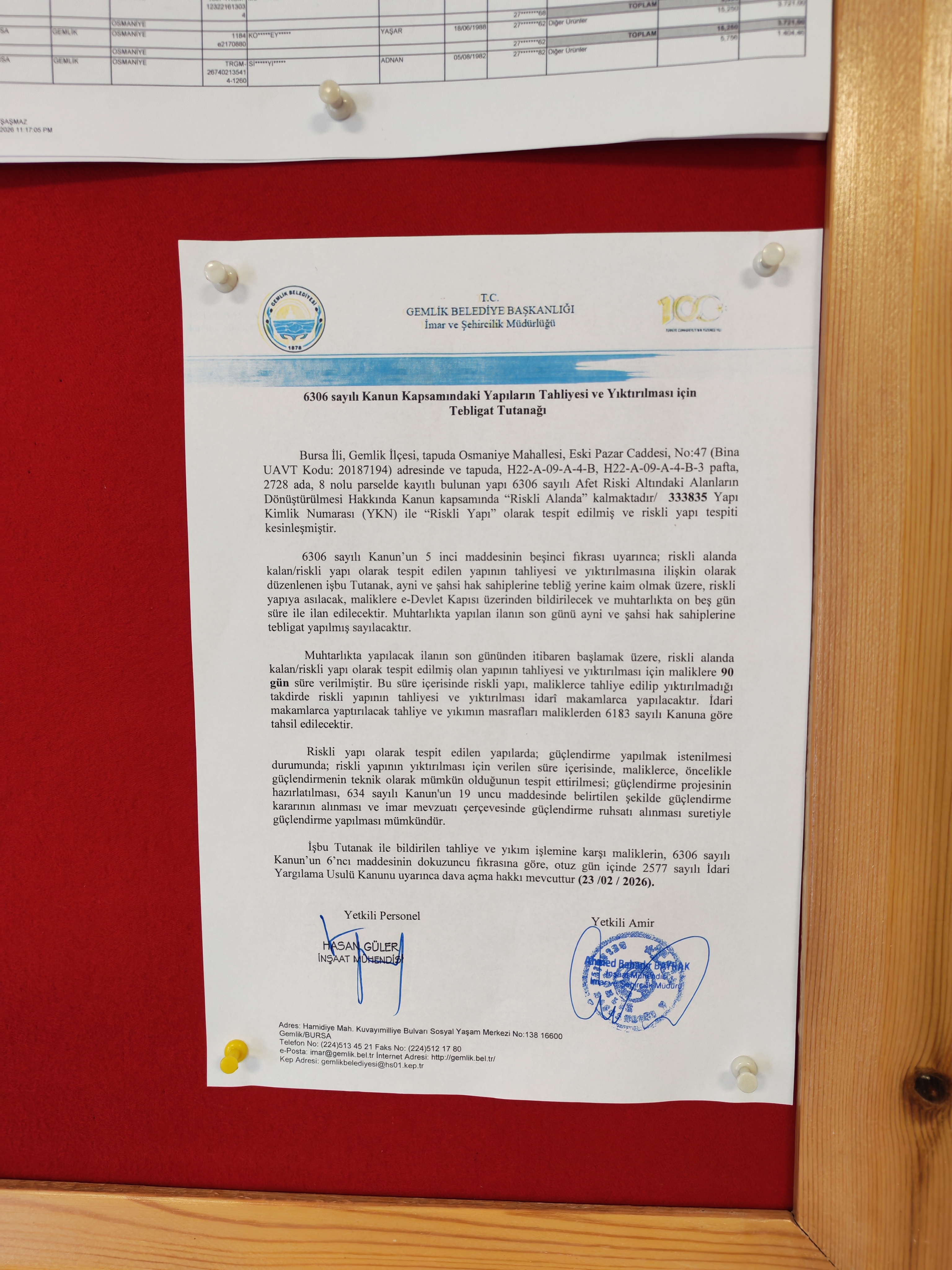 6306 sayılı Kanun’un 5 inci maddesinin beşinci fıkrası uyarınca; riskli alanda kalan/riskli yapı olarak tespit edilen yapının tahliyesi ve yıktırılmasına ilişkin olarak düzenlenen işbu Tutanak, ayni ve şahsi hak sahiplerine tebliğ yerine kaim olmak üzere, riskli yapıya asılacak, maliklere e-Devlet Kapısı üzerinden bildirilecek ve muhtarlıkta on beş gün süre ile ilan edilecektir. Muhtarlıkta yapılan ilanın son günü ayni ve şahsi hak sahiplerine tebligat yapılmış sayılacaktır.