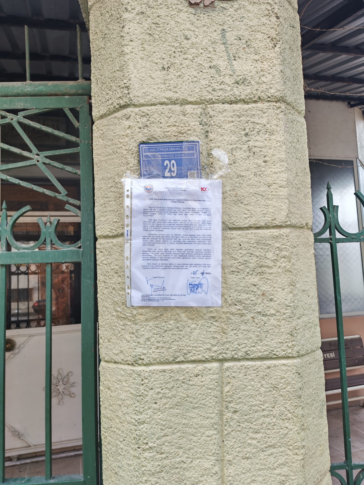 6306 sayılı Kanun’un 5 inci maddesinin beşinci fıkrası uyarınca; riskli alanda kalan/riskli yapı olarak tespit edilen yapının tahliyesi ve yıktırılmasına ilişkin olarak düzenlenen işbu Tutanak, ayni ve şahsi hak sahiplerine tebliğ yerine kaim olmak üzere, riskli yapıya asılacak, maliklere e-Devlet Kapısı üzerinden bildirilecek ve muhtarlıkta on beş gün süre ile ilan edilecektir. Muhtarlıkta yapılan ilanın son günü ayni ve şahsi hak sahiplerine tebligat yapılmış sayılacaktır.