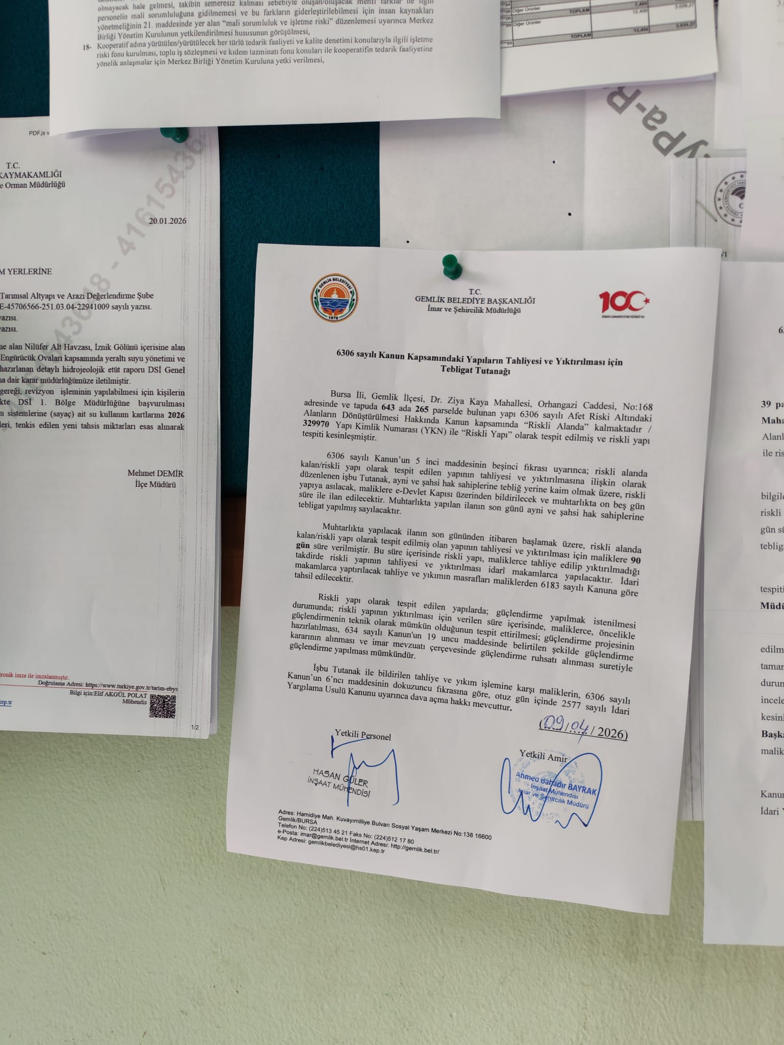 6306 sayılı Kanun’un 5 inci maddesinin beşinci fıkrası uyarınca; riskli alanda kalan/riskli yapı olarak tespit edilen yapının tahliyesi ve yıktırılmasına ilişkin olarak düzenlenen işbu Tutanak, ayni ve şahsi hak sahiplerine tebliğ yerine kaim olmak üzere, riskli yapıya asılacak, maliklere e-Devlet Kapısı üzerinden bildirilecek ve muhtarlıkta on beş gün süre ile ilan edilecektir. Muhtarlıkta yapılan ilanın son günü ayni ve şahsi hak sahiplerine tebligat yapılmış sayılacaktır.