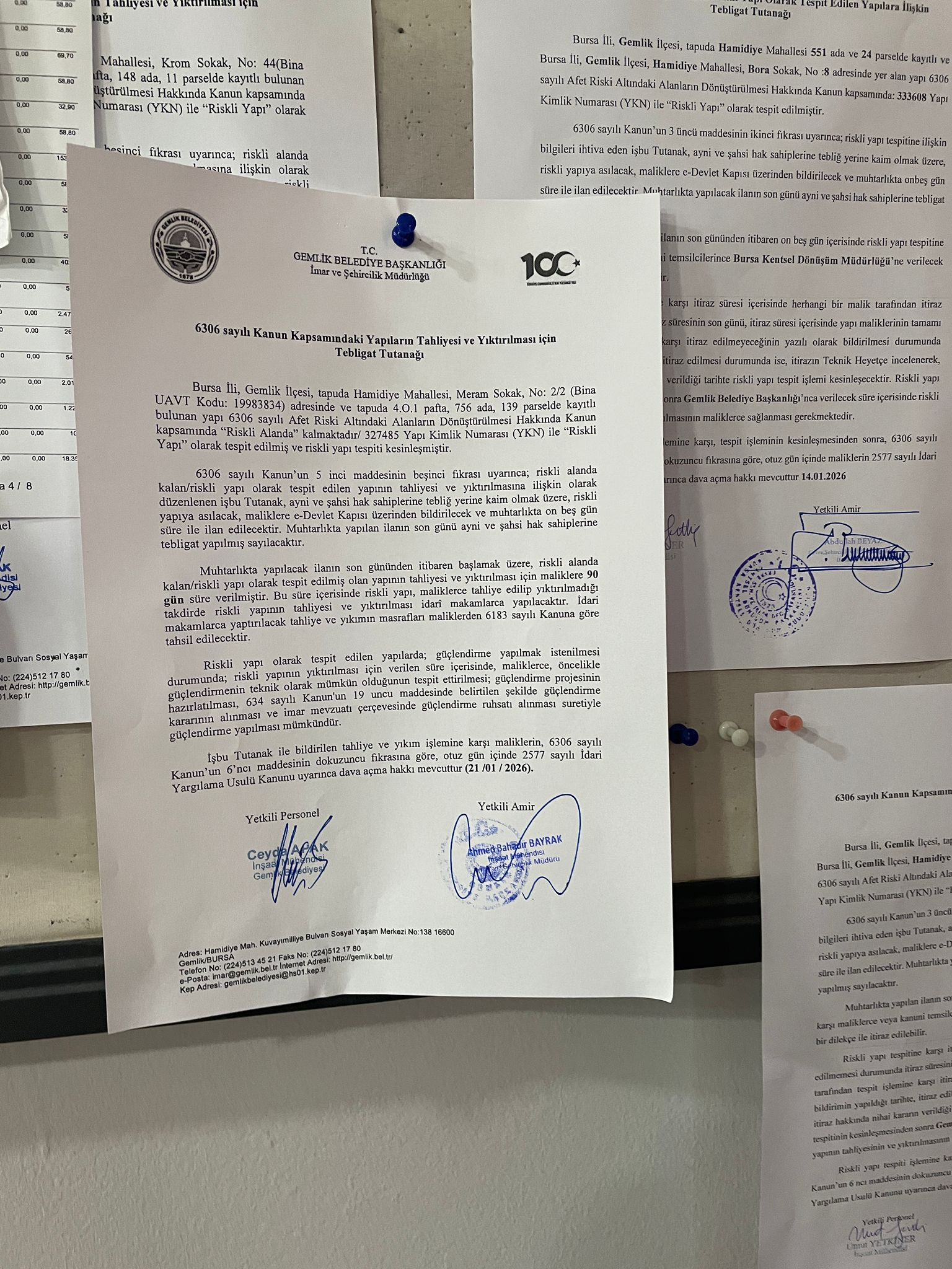6306 sayılı Kanun’un 5 inci maddesinin beşinci fıkrası uyarınca; riskli alanda kalan/riskli yapı olarak tespit edilen yapının tahliyesi ve yıktırılmasına ilişkin olarak düzenlenen işbu Tutanak, ayni ve şahsi hak sahiplerine tebliğ yerine kaim olmak üzere, riskli yapıya asılacak, maliklere e-Devlet Kapısı üzerinden bildirilecek ve muhtarlıkta on beş gün süre ile ilan edilecektir. Muhtarlıkta yapılan ilanın son günü ayni ve şahsi hak sahiplerine tebligat yapılmış sayılacaktır.