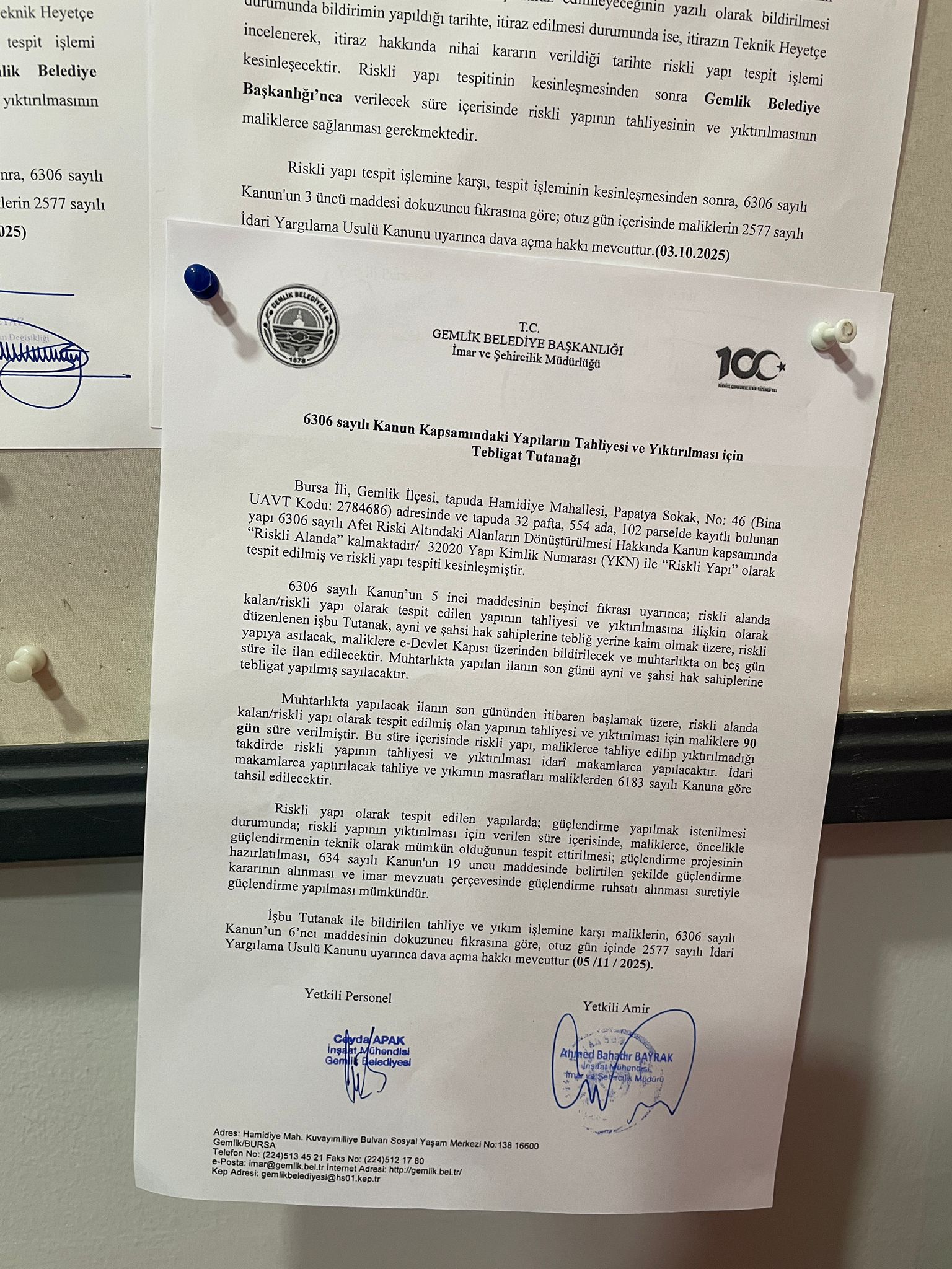 6306 sayılı Kanun’un 5 inci maddesinin beşinci fıkrası uyarınca; riskli alanda kalan/riskli yapı olarak tespit edilen yapının tahliyesi ve yıktırılmasına ilişkin olarak düzenlenen işbu Tutanak, ayni ve şahsi hak sahiplerine tebliğ yerine kaim olmak üzere, riskli yapıya asılacak, maliklere e-Devlet Kapısı üzerinden bildirilecek ve muhtarlıkta on beş gün süre ile ilan edilecektir. Muhtarlıkta yapılan ilanın son günü ayni ve şahsi hak sahiplerine tebligat yapılmış sayılacaktır.