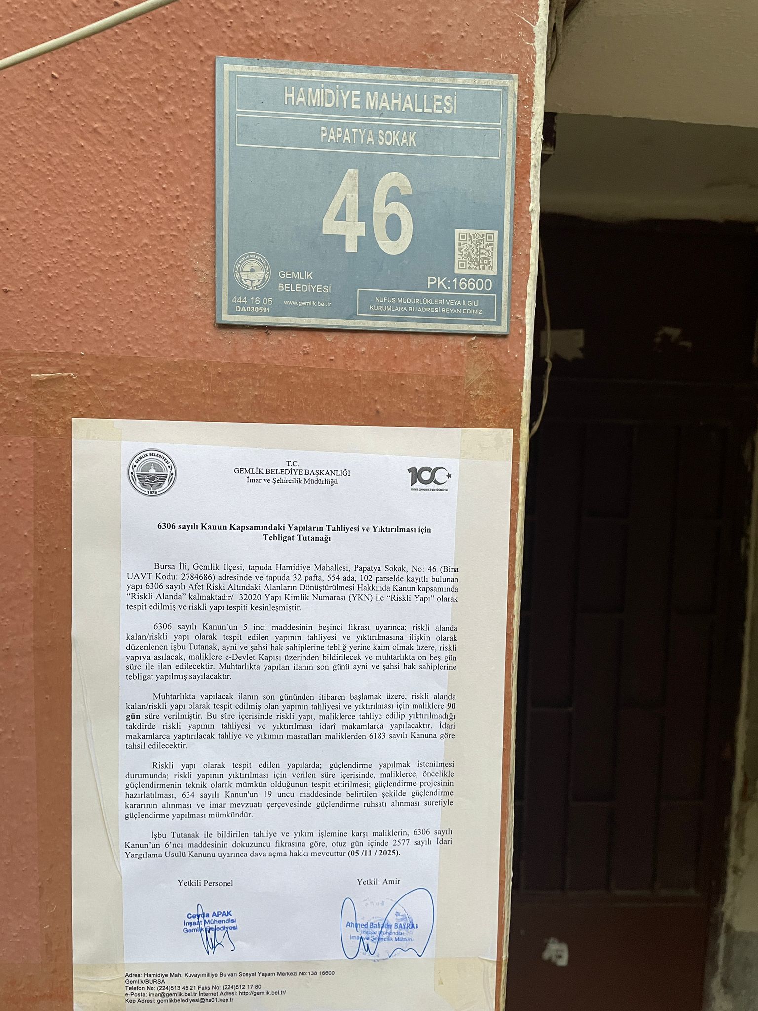Bursa İli, Gemlik İlçesi, tapuda Hamidiye Mahallesi, Papatya Sokak, No: 46 (Bina UAVT Kodu: 2784686) adresinde ve tapuda 32 pafta, 554 ada, 102 parselde kayıtlı bulunan yapı 6306 sayılı Afet Riski Altındaki Alanların Dönüştürülmesi Hakkında Kanun kapsamında “Riskli Alanda” kalmaktadır/ 32020 Yapı Kimlik Numarası (YKN) ile “Riskli Yapı” olarak tespit edilmiş ve riskli yapı tespiti kesinleşmiştir.