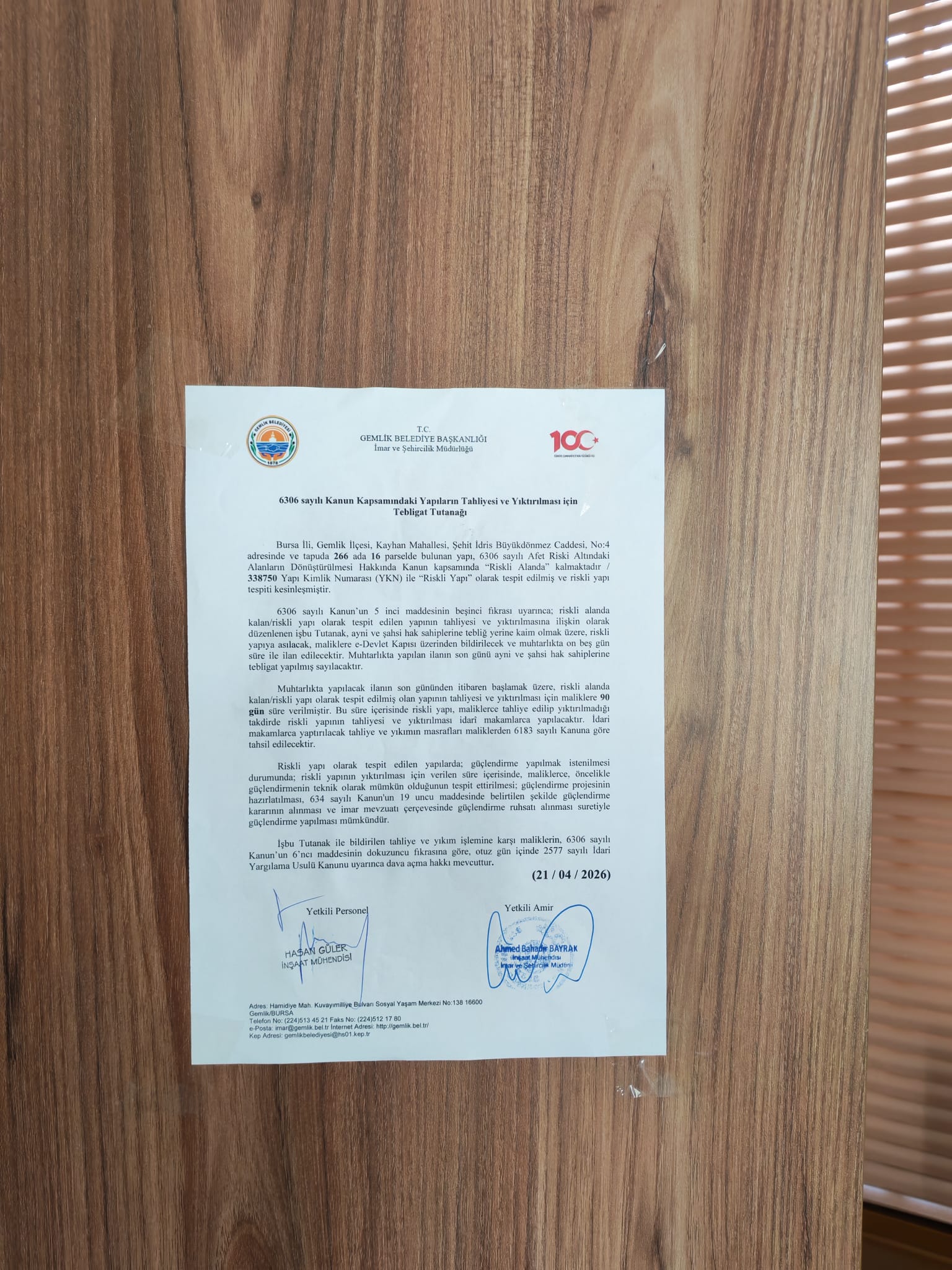 Bursa İli, Gemlik İlçesi, Kayhan Mahallesi, Şehit İdris Büyükdönmez Caddesi, No:4 adresinde ve tapuda 266 ada 16 parselde bulunan yapı, 6306 sayılı Afet Riski Altındaki Alanların Dönüştürülmesi Hakkında Kanun kapsamında “Riskli Alanda” kalmaktadır / 338750 Yapı Kimlik Numarası (YKN) ile “Riskli Yapı” olarak tespit edilmiş ve riskli yapı tespiti kesinleşmiştir.
