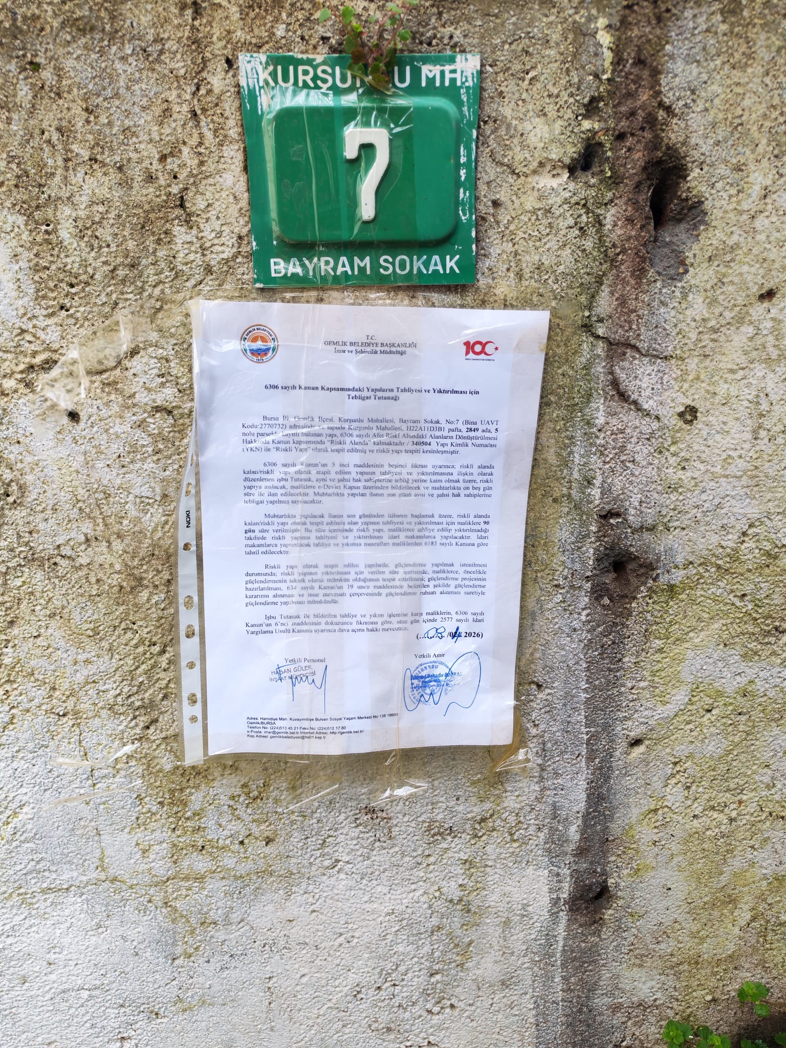 Bursa İli, Gemlik İlçesi, Kurşunlu Mahallesi, Bayram Sokak, No:7 (Bina UAVT Kodu:2770732) adresinde ve tapuda Kurşunlu Mahallesi, H22A11D3B1 pafta, 2849 ada, 5 nolu parselde kayıtlı bulunan yapı, 6306 sayılı Afet Riski Altındaki Alanların Dönüştürülmesi Hakkında Kanun kapsamında “Riskli Alanda” kalmaktadır / 340504 Yapı Kimlik Numarası (YKN) ile “Riskli Yapı” olarak tespit edilmiş ve riskli yapı tespiti kesinleşmiştir.